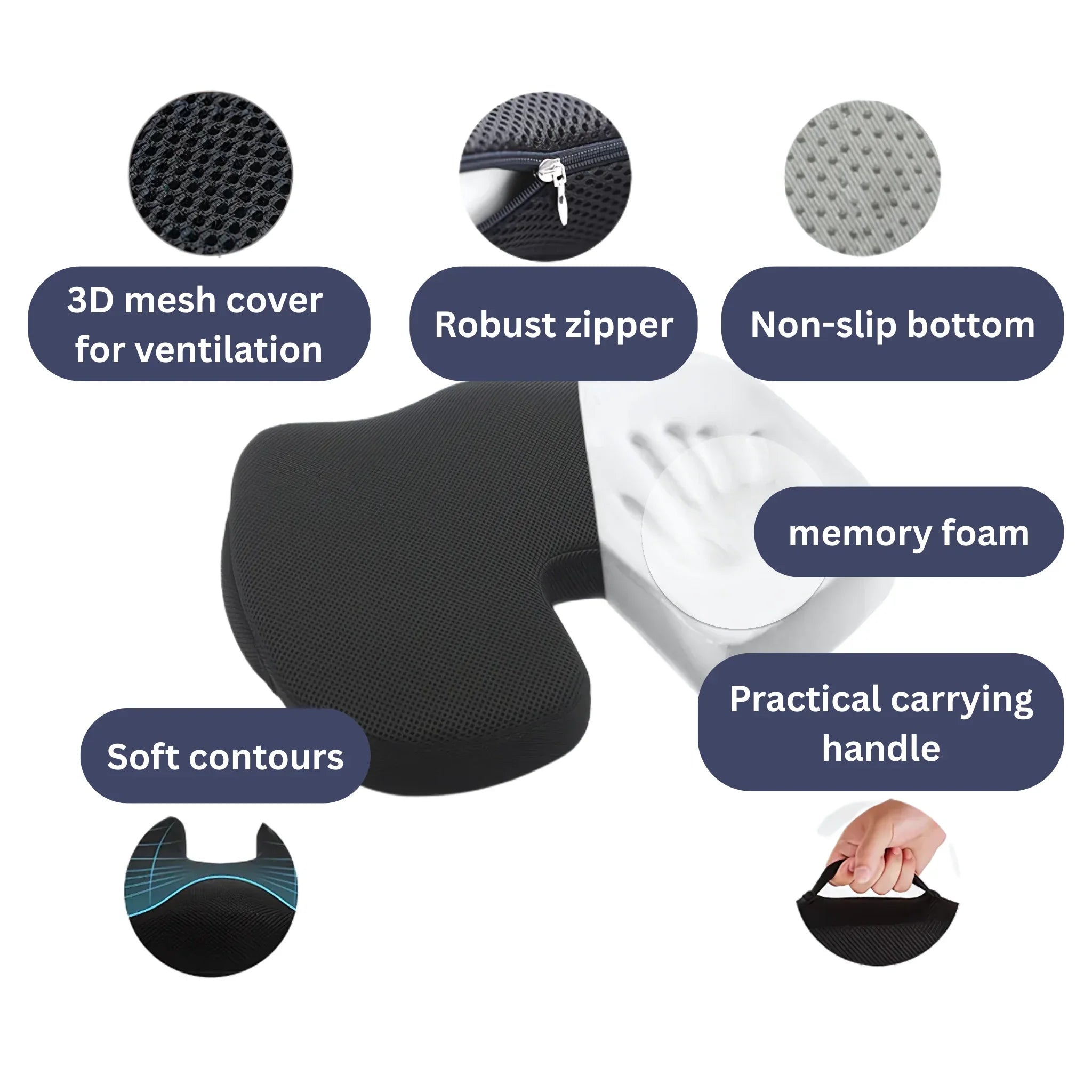 The U-shaped tailbone cutout reduces pressure on the sacrum and supports the natural alignment of the spine.